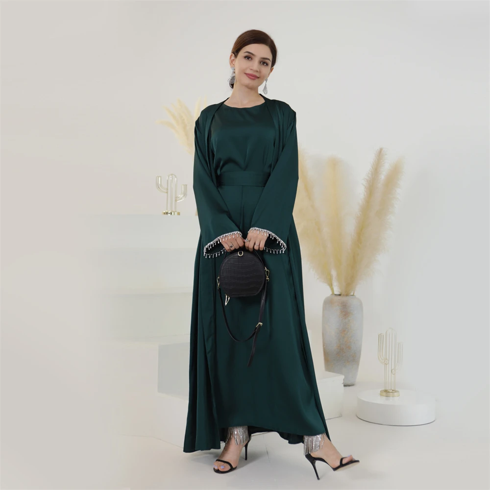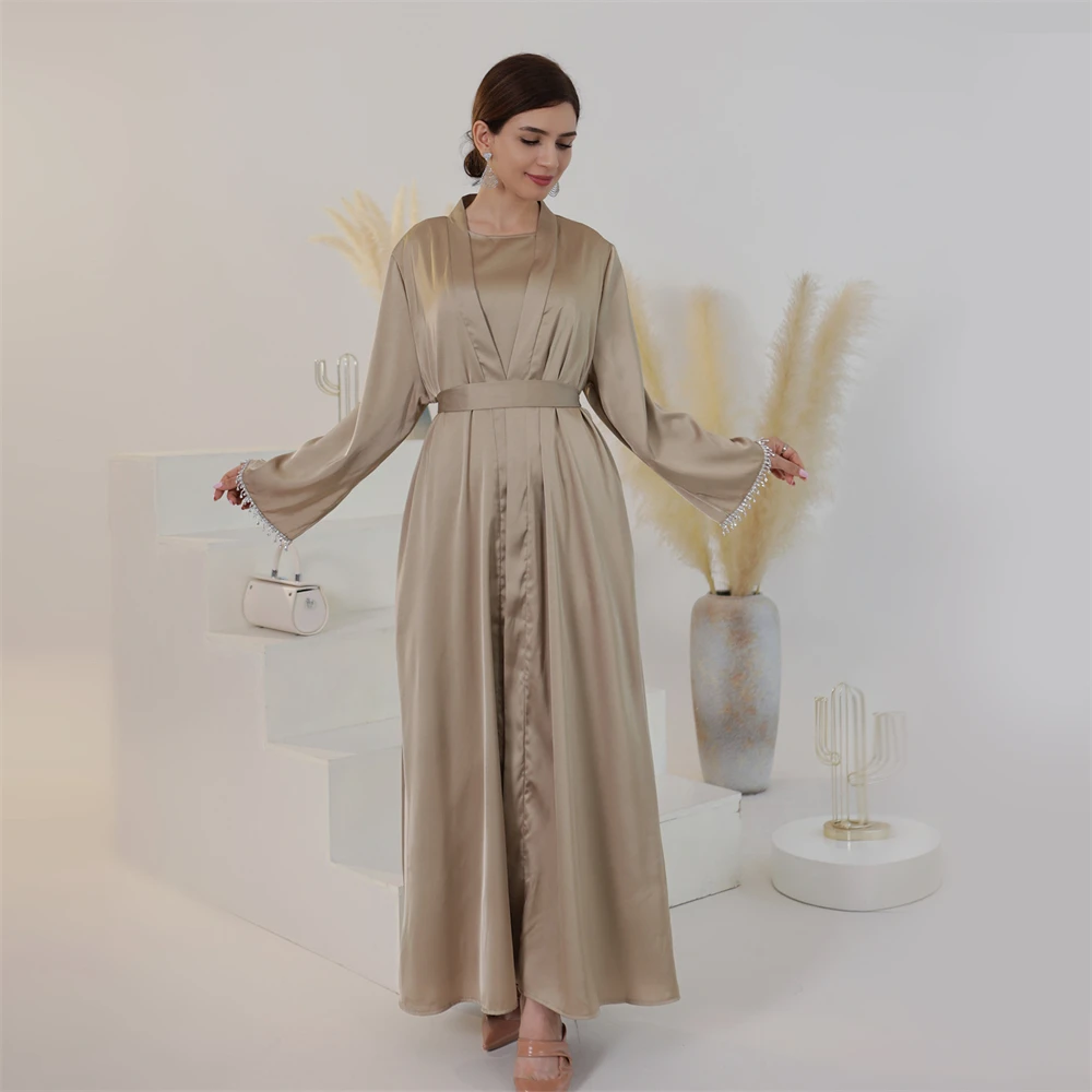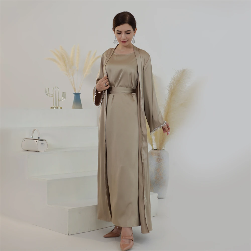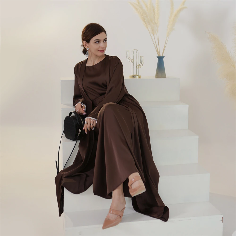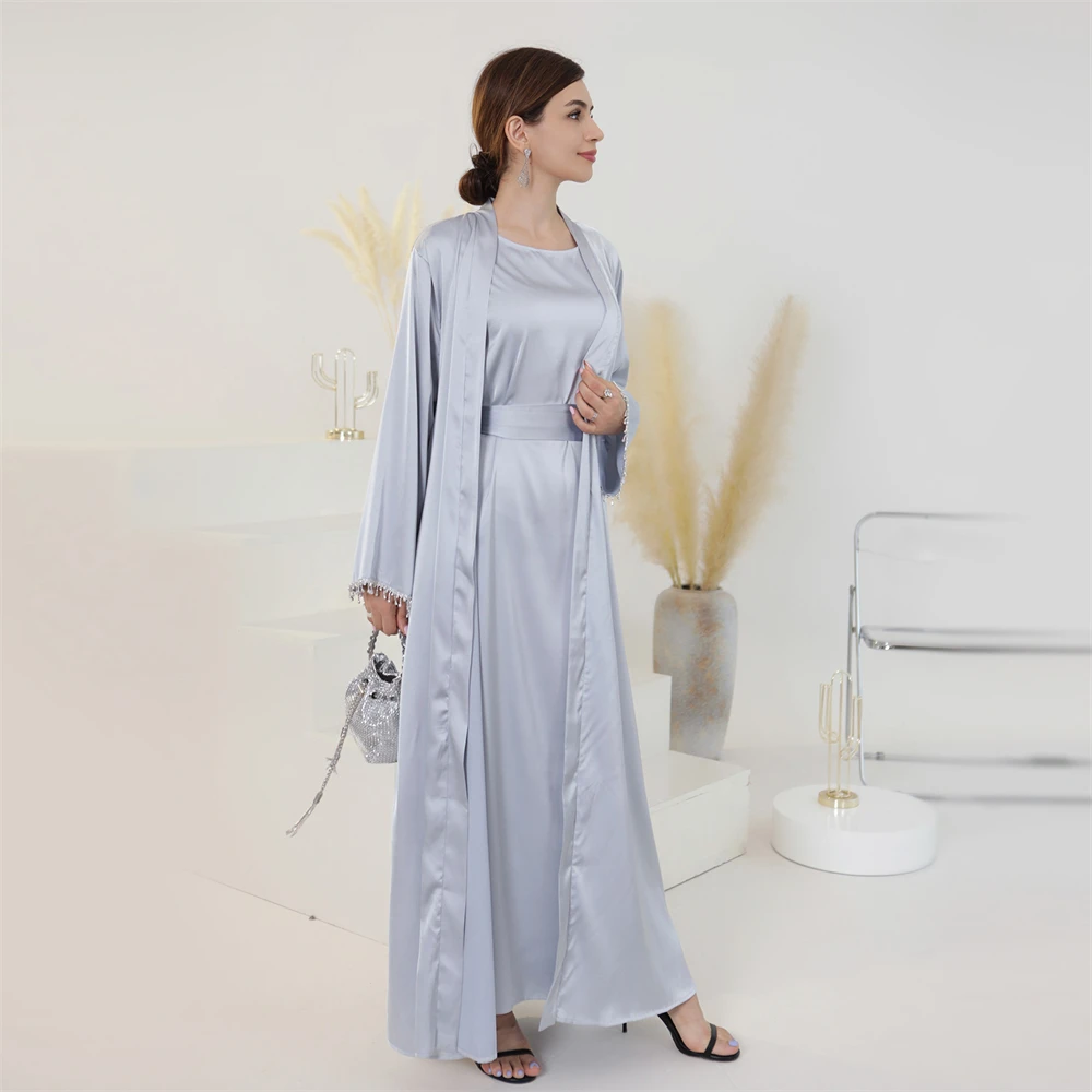 Eid Ramadan Satin Open Abaya Kimono 2 Piece Sets Muslim Women Dresses Turkey Arabic Kaftan Party Dubai Abayas Gown Outfit Caftan